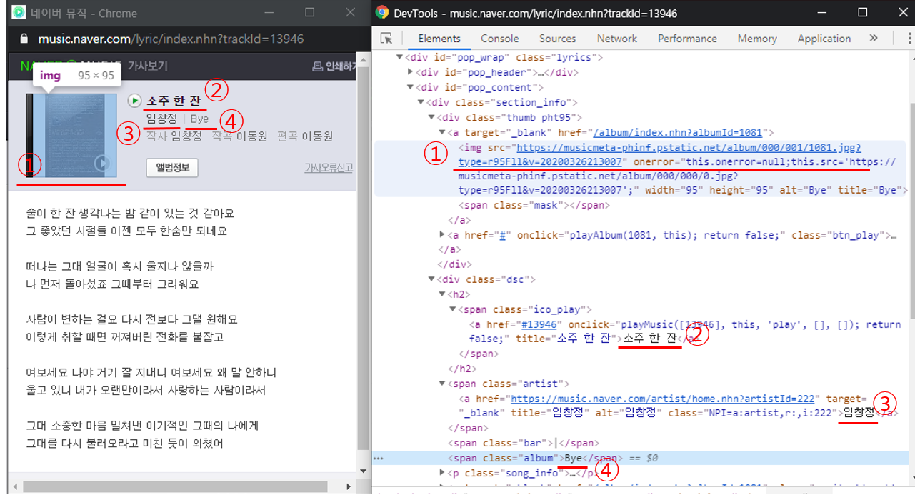 따라서 우리는, 네이버 뮤직에서 원하는 곡의 가사 링크의 url을 크롤링하도록 하자.