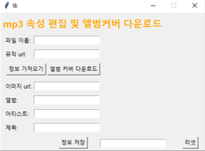 l0 = Label(window, text = 'mp3 속성 편집 및 앨범커버 다운로드', fg = 'orange', font = 'helvetica 16 bold')