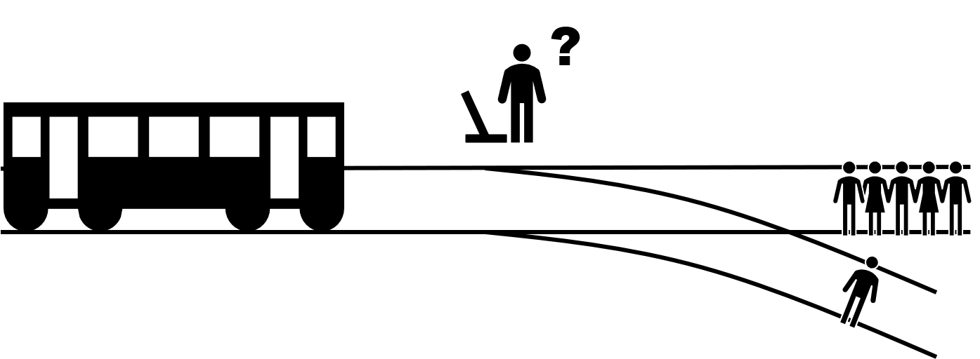나는 선로전환기 앞에 서 있고, 눈앞에는 두 갈래로 나뉘는 선로가 있다. 한쪽에는 5명의 사람이, 한쪽에는 1명의 사람이 서있다. 저 멀리서 고장 난 열차가 달려오고 있고, 이대로 있다간 5명의 사람이 열차에 치이는 상황이 발생한다. 사람을 움직일 수는 없고, 단지 열차의 방향만을 결정할 수 있다. 그렇다면 나는 어떻게 할 것인가. 그대로 5명이 치이는 상황을 보고 있을 것인가? 아니면 선로전환기를 작동시켜 1명이 치이도록 만들 것인가?