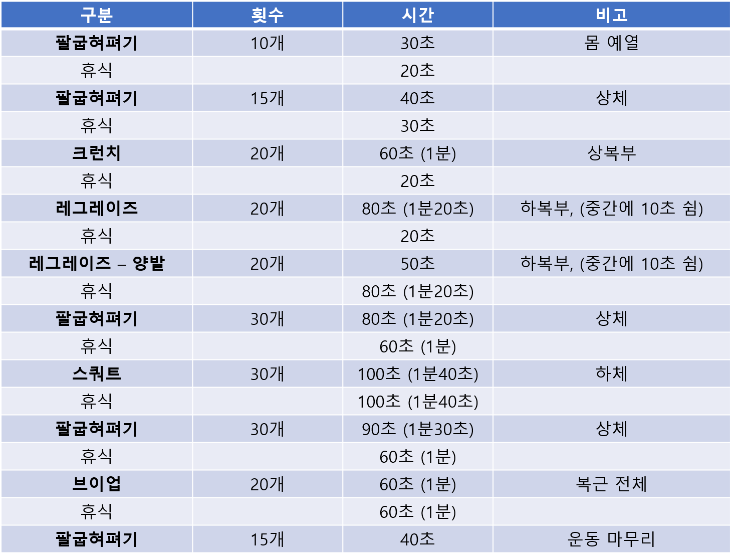개수와 소요시간은 본인에 맞는 정도로 설정, 측정해본 결과다. 꼭 개수를 채우거나 시간에 맞추려 하지 말고 할 수 있는 정도로 해야한다. 힘이 들면 자세가 무너지고 무리가 갈 수 있기 때문에 본인에게 맞는 정도를 알고 운동해야한다.