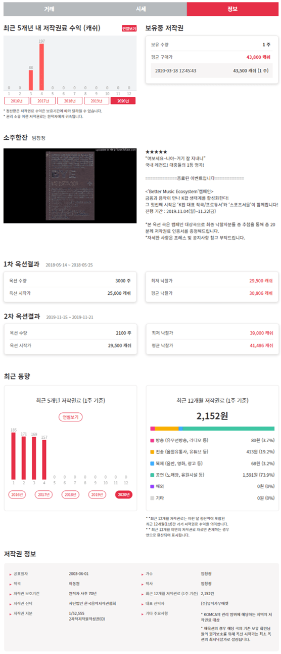 정보 탭에서는 최근 5년간 본인의 해당 저작권료 수익과 보유 수량 및 평균 구매가를 보여준다. 곡에 대한 간단한 소개가 이어지고, 옥션의 결과를 보여준다.(왜 보여주는지는 모르겠다.) 이어서 최근 5년간 저작권료를 보여주고 최근 12개월 동안 저작권이 어디에서 어떻게 발생했는지를 표시해준다. 만약 보유하지 않고 있는 곡이라면 곡에 대한 소개부터 시작한다.