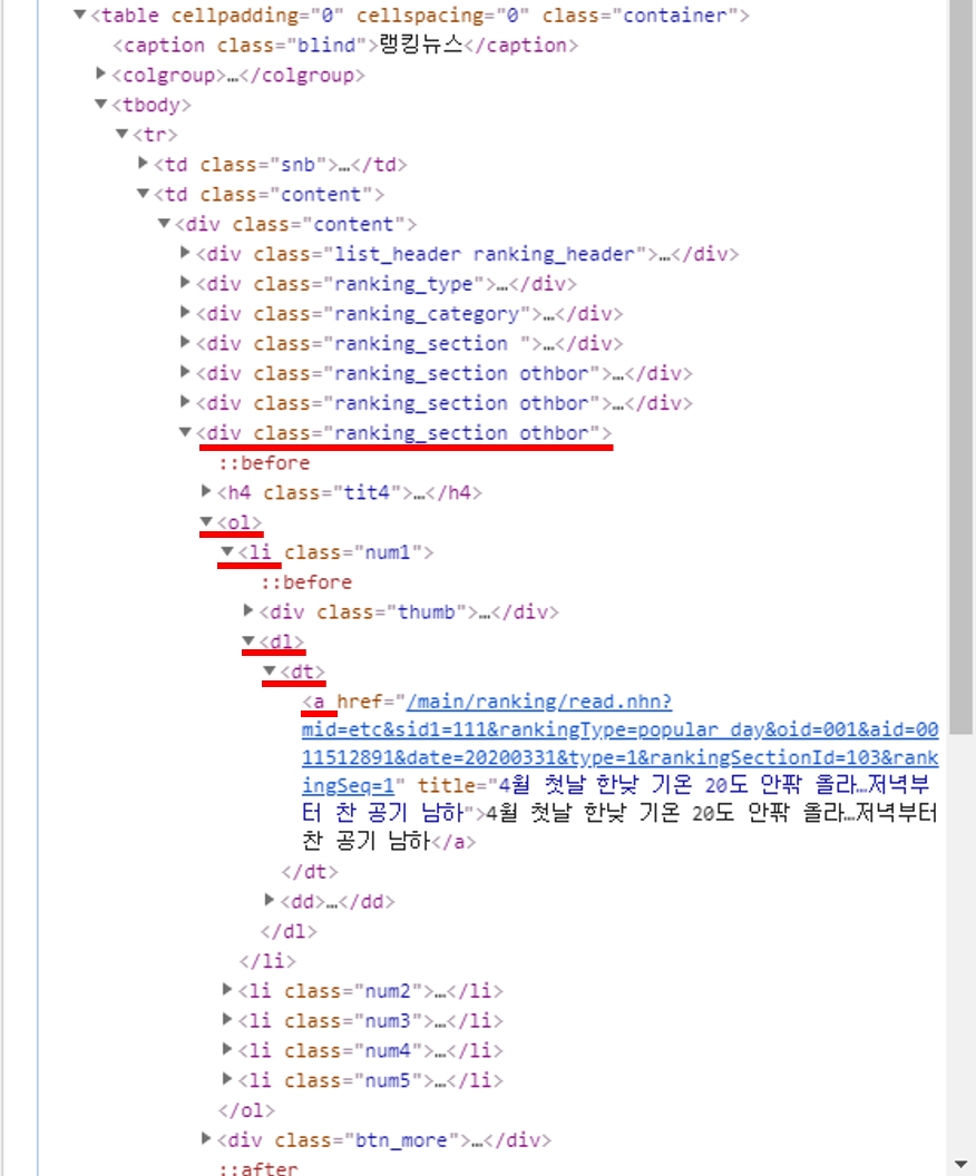 여기서 기사 제목이 담겨있는 항목을 찾아보자. 자세히 살펴보면 class 이름이 ranking_section othbor 인 div 안에, ol 안에, li 안에, dl 안에, dt 안에 a 안에 있는 title에 뉴스 기사의 제목이 있는 것을 확인할 수 있다.