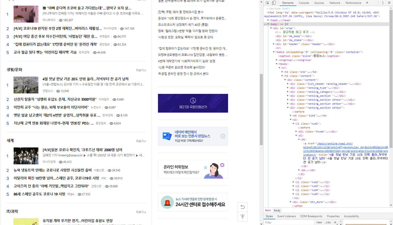 크롬으로 네이버 뉴스 - 랭킹 뉴스에 접속하여 f12를 눌러보면 다음과 같은 탭이 열린다.