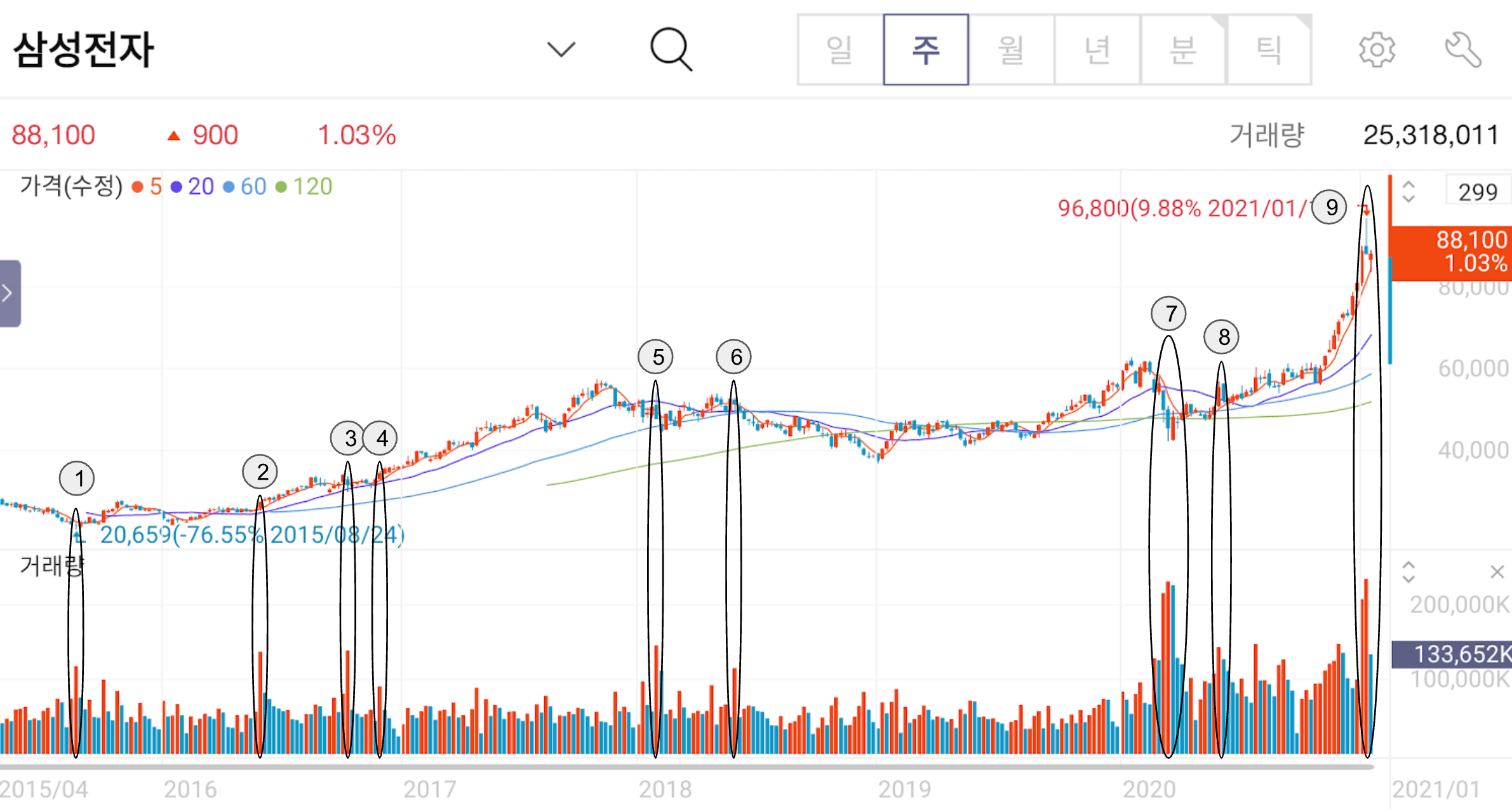 실제로 삼성전자 주가와 거래량을 보며 이야기해보자.