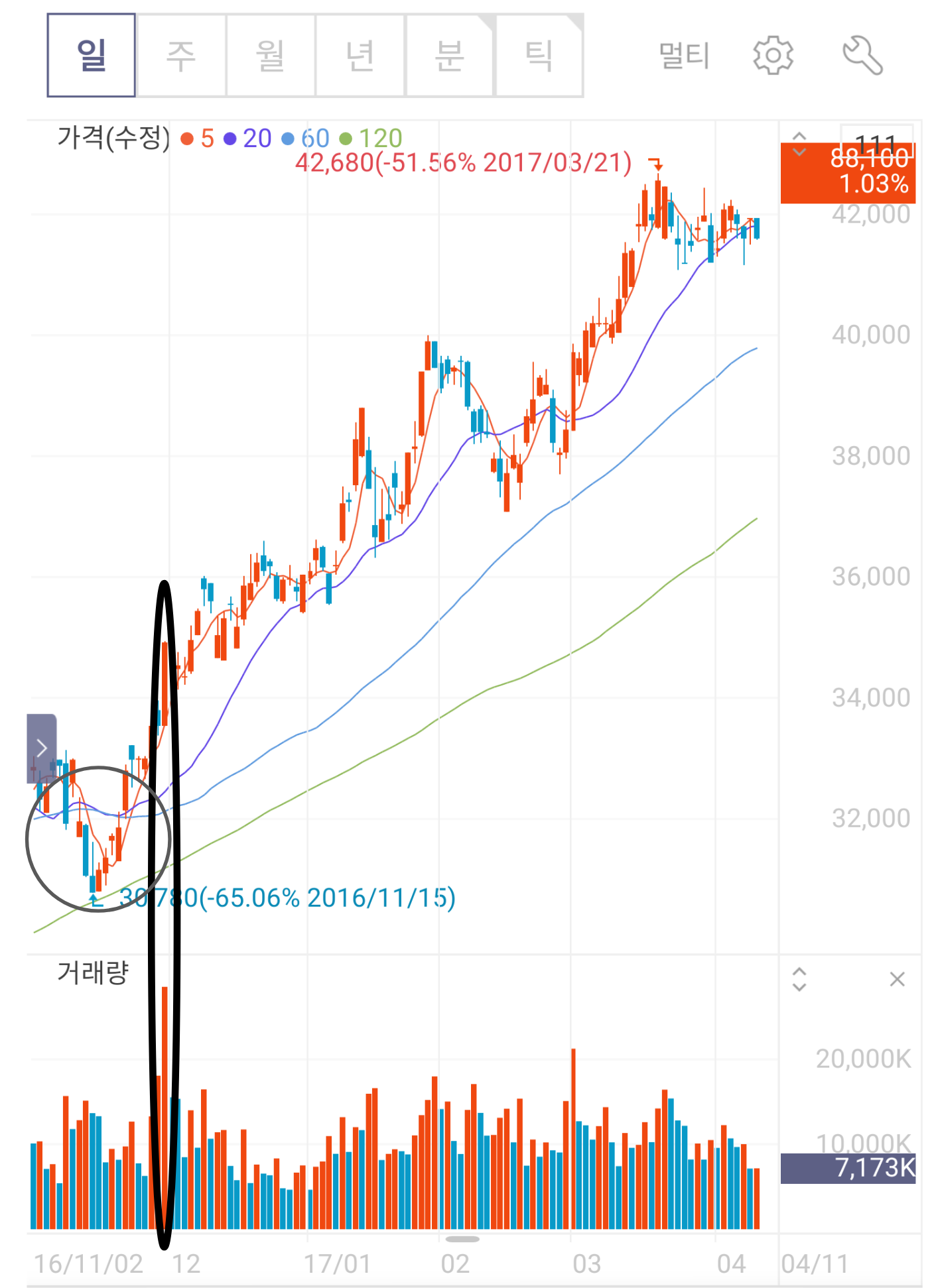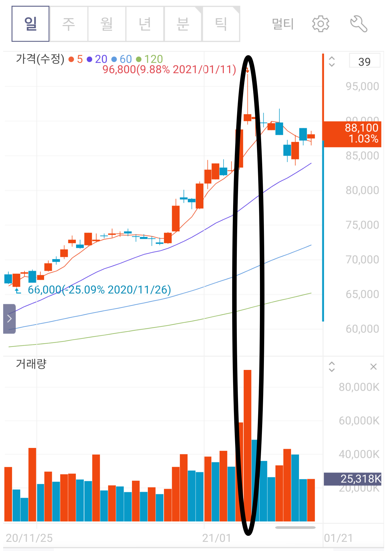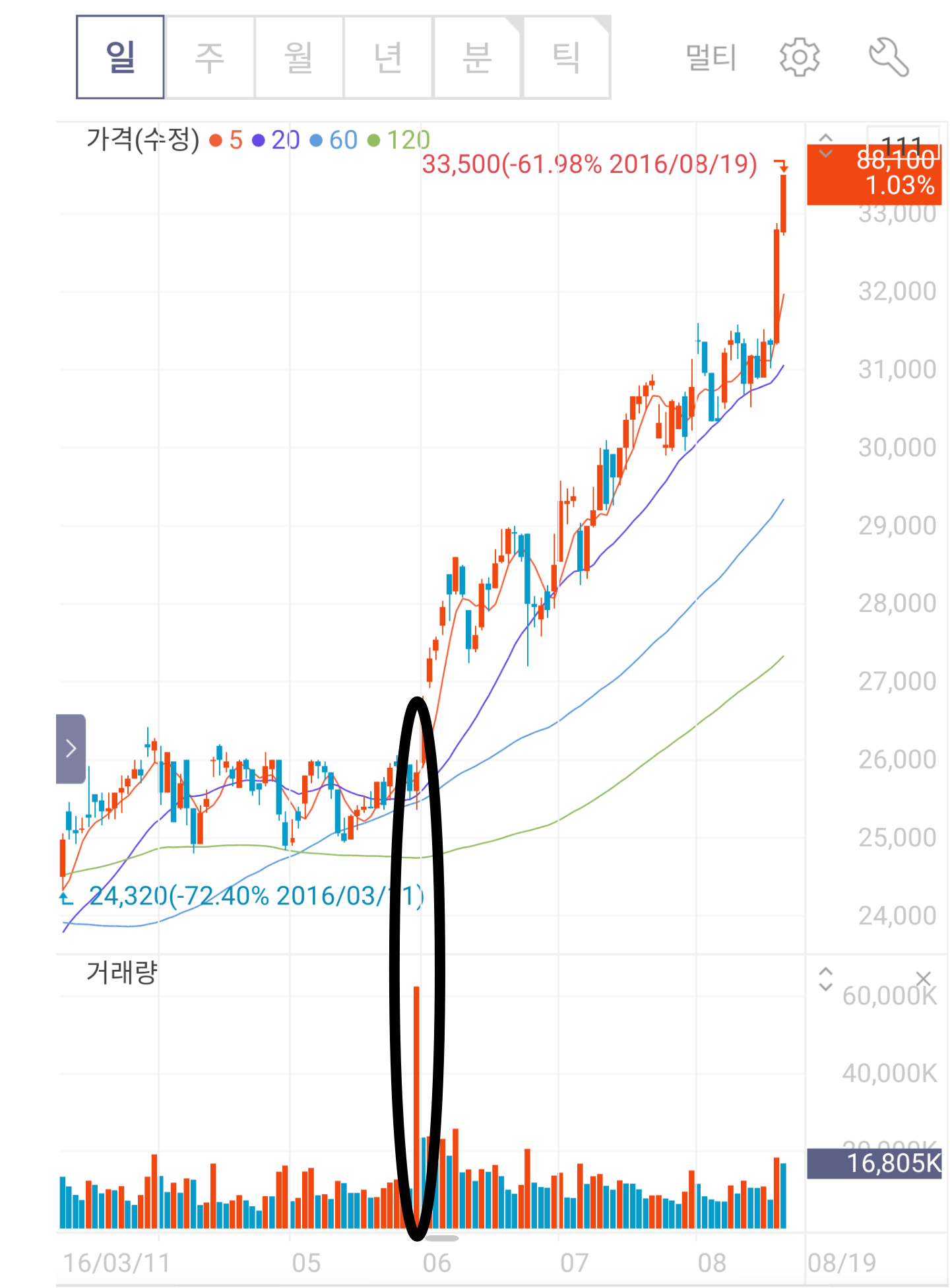 말에 앞서, 거래량이 많다의 기준은 전일(혹은 주, 월) 대비 금일(혹은 주, 월)의 거래량이 2배 언저리인 경우이다.