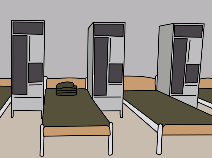 다양한 매체에서 보여지는 군대 생활관(혹은 내무반)의 모습이다. 복도를 중심으로 양쪽에 침상이 있고, 벽쪽에 관물대를 밀어둔다.