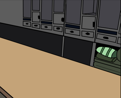 다양한 매체에서 보여지는 군대 생활관(혹은 내무반)의 모습이다. 복도를 중심으로 양쪽에 침상이 있고, 벽쪽에 관물대를 밀어둔다.