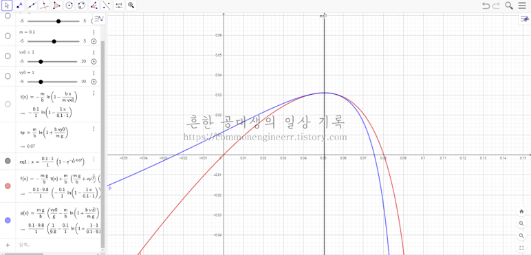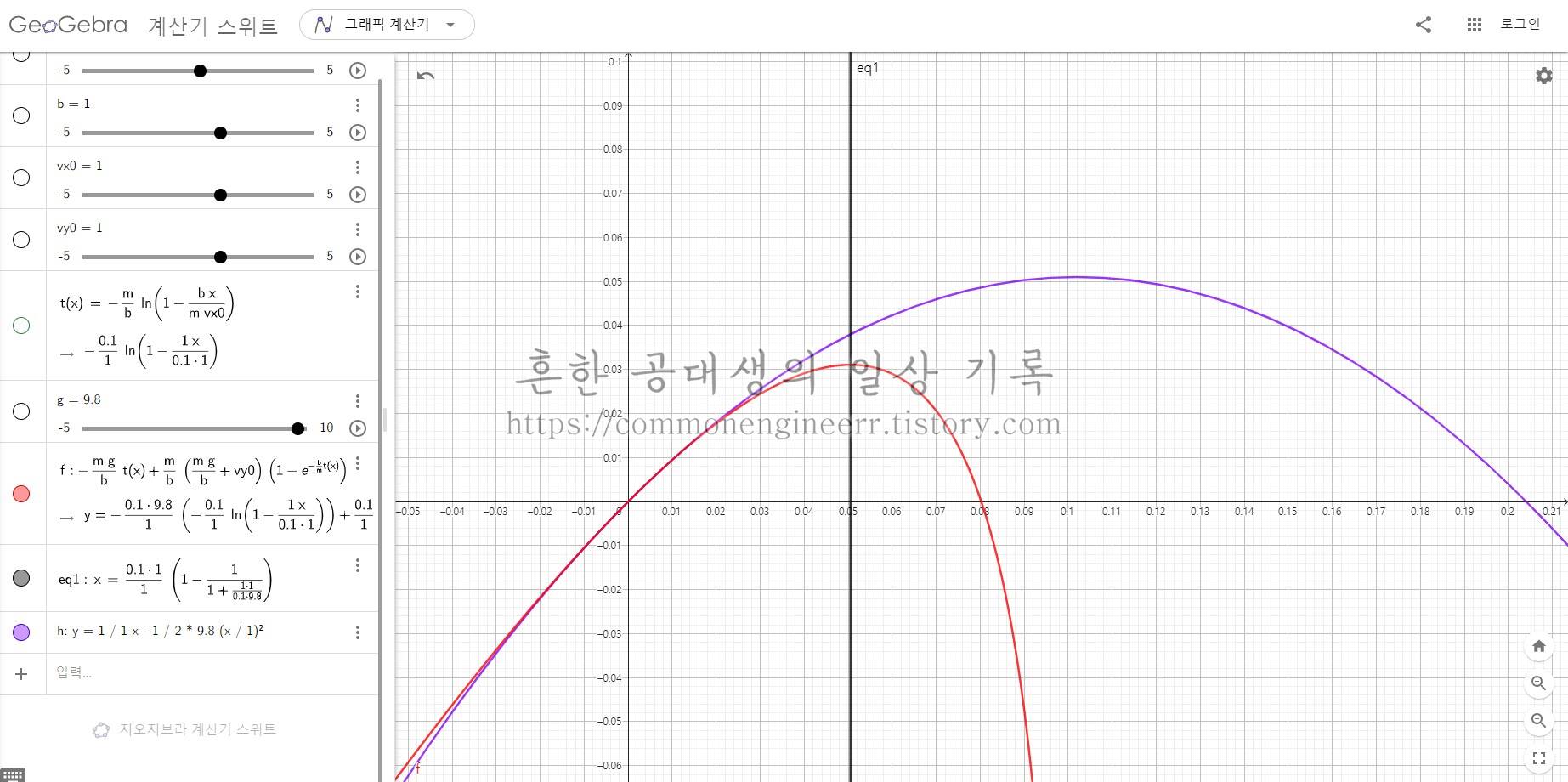 결과를 지오지브라 클래식을 이용하여 나타내면 다음과 같다. 변수에는 다음의 값을 적용했다. \( m = 0.1 \), \( b = 1 \), \( v_{x0} = 1 \), \( v_{y0} = 1 \)