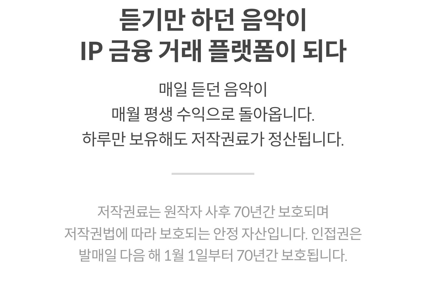 투자에 관해 알아보던 중 페이스북과 티스토리 광고에서 알게 된 플랫폼이다. (당연히 거짓이라 생각했지만) 18%의 수익률이라는 문구가 이목을 끌었고, 음악의 저작권을 거래한다는 점에 흥미
