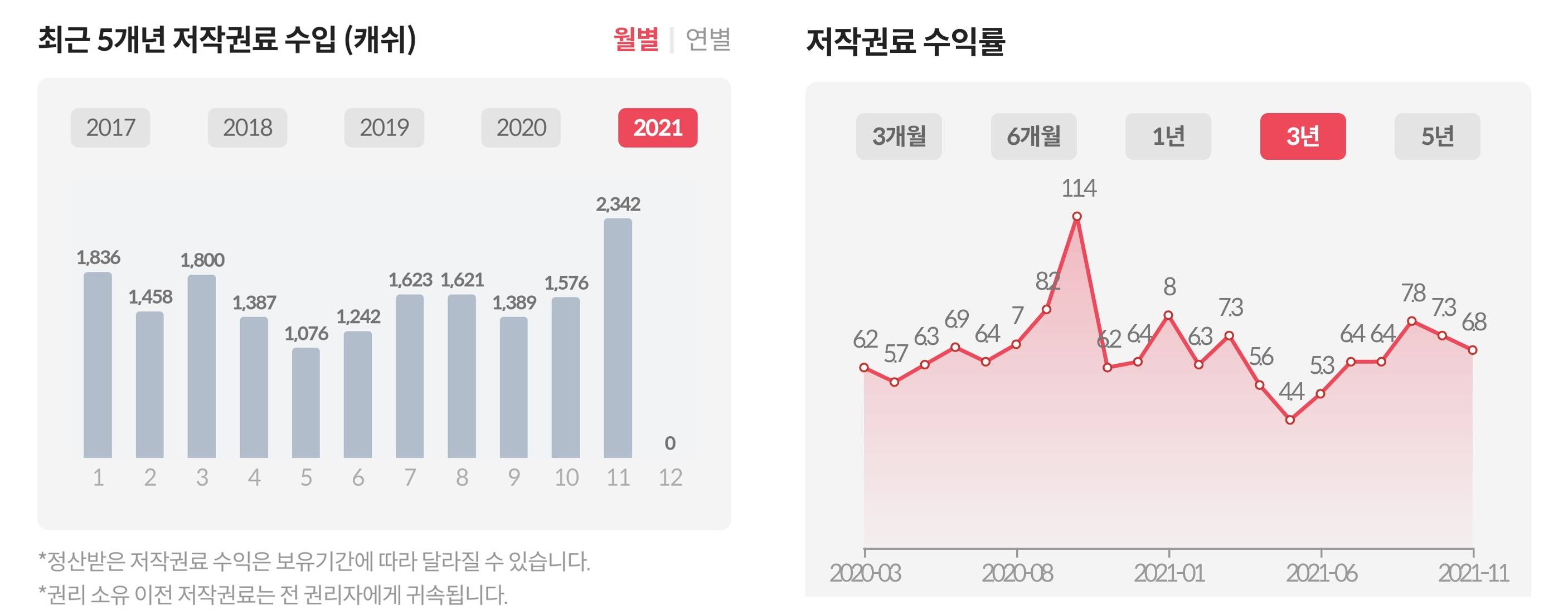 추가로 MCPI 음악 저작권 지수라는, 주식으로 따지면 코스피 지수처럼 시장의 흐름을 파악할 수 있는 지표를 제공하고 있다. 정말 많이 성장했다. 이렇게 놓고 보면 2020년 초에 시작한 나는 리틀 얼리어탑터인 것 같다.