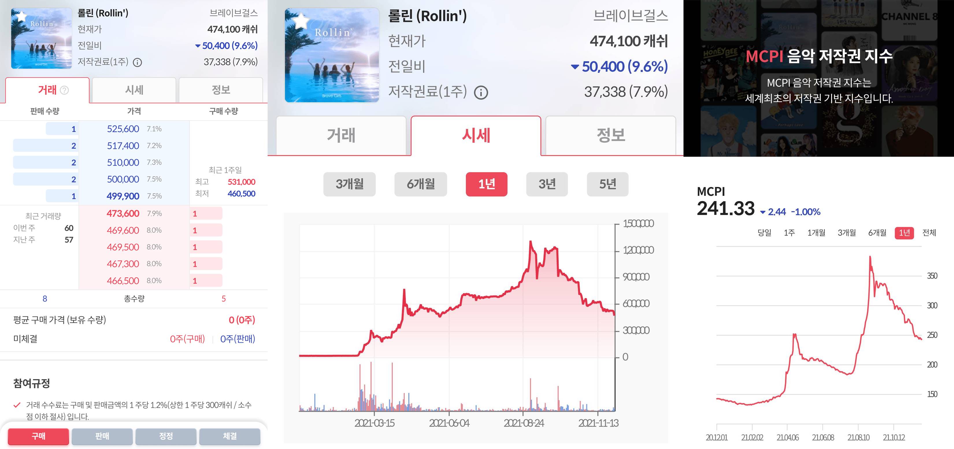 후술하겠지만 MCPI 음악 저작권 지수라는 것 생겼는데 (일종의 코스피 지수 같은 느낌이다) 이를 참고하면 롤린 시세와 더불어 21년 3월을 기점으로 지수가 급속 성장한다. 롤린의 역주행이 저작권료 상승으로 인한 기대감에 투자자들의 유입을 불러왔다고 볼 수 있다.