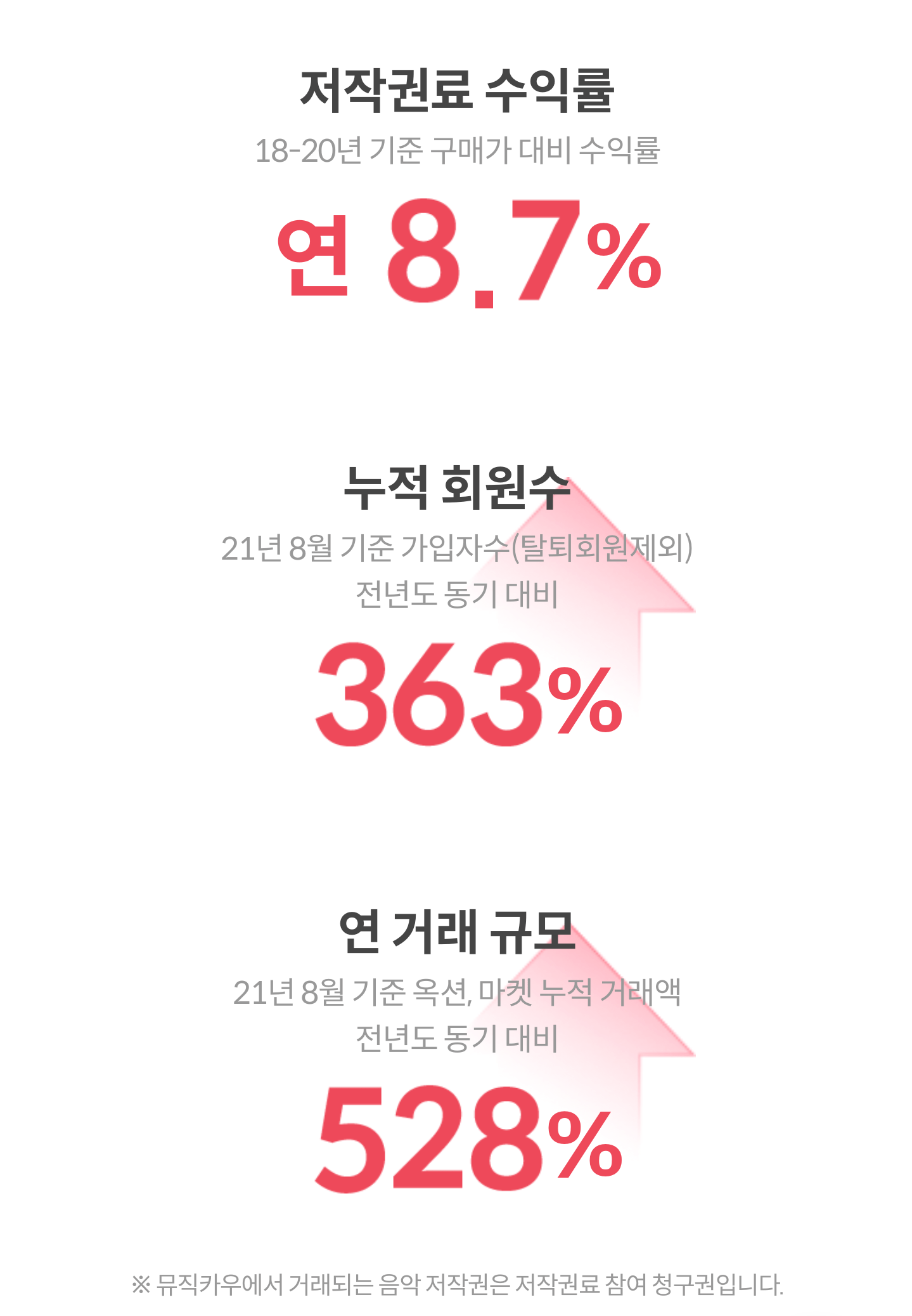 우선 너무나 좋은 서비스다. 저작권자(창작자)는 이후에 받을 저작권료를 미리 수익화하여 다음 활동에 대한 빠른 투자가 가능해진다. 투자자는 연 8.7%(뮤직카우에서 홍보하는 수치, 무지성으로 투자해도 본인처럼 6% 이상의 수익은 가능할 듯) 의 안정적인 현금흐름을 창출하면서 시세 차익까지 노릴 수 있는 기회를 가진다. 또한 저작권료를 올리기 위해서라도 해당 곡을 많이 듣고 부르며 응원하게 될 것이다. 자연스럽게 음악 시장에 관심과 참여가 많아지고 자금이 유입되며 시장의 성장이라는 선순환 구조를 이루는 현명한 플랫폼이라 생각한다.