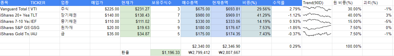 정말 이제 시작하는 개미라고 생각하고 시드를 약 300만원으로 잡았다. 현재가 기준으로 VTI 3주 + TLT 7주 + IEF 3주 + GSG 9주 + IAU 5주를 구매하여 원하는 비율의 포트포리오를 구성했다. 주식 수가 적어서 리밸런싱을 할 수 있을지에 대한 의문이 들며 리밸런싱이 어려운 포트폴리오가 의미가 있을까에 대한 생각이 든다.