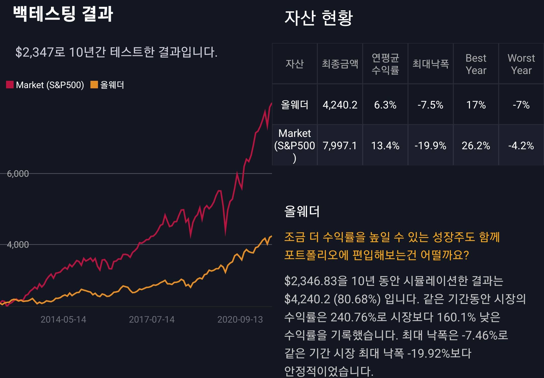 시기를 특정해서 들여다보면 더욱 놀랍다. S&P500이 –36.81%였던 2008년 금융위기 때, 올웨더는 –1.31%였다. 코로나 팬데믹이었던 2020년에는 폭락한 주식시장과는 달리 올웨더의 수익률은 마이너스로 떨어지지 않았다. 물론 그 이후에 주식시장이 빠르게 회복하여 결과적으로는 비슷해 보일 수 있지만, 앞으로도 주식시장의 성장이 그렇게 클 것이라고는 확신할 수 없기 때문에 올웨더의 가치는 분명히 있다.