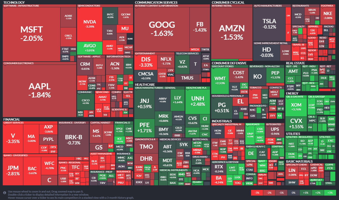 섹터들의 특징과 흐름을 알면 시장에 대해 잘 이해할 수 있다. 핀비즈 (https://finviz.com/map.ashx?t=sec) 에서는 미국 S&P500 혹은 전 세계 주식을 섹터별로 나누어 시가총액과 등락률을 시각적으로 표현해두었다. 참고하면서 만들었으니 참고하면서 보면 쉬울 것이다.